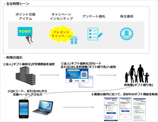 「選べるe-GIFT」は、人気の電子マネー全6種類(ANA SKY コイン 、nanacoギフト、EdyギフトID、iTunesギフトコード、Amazonギフト券、レコチョク プリペイド [2015年10月6日現在] )の中から、ギフトを提供したいと考える法人(ギフト提供元)が、利用者(ギフト贈り先)の特性に合わせた電子マネーを選び、1つのギフト券として贈ることができる※1法人向けマルチギフトサービスです。「選べるe-GIFT」を受け取った利用者は、カードに印刷されたQRコードやメールに記載されているURLから専用サイトにアクセスし、お好みの電子マネー等を受け取ることができます。 ※1 電子マネーの組合せには、制限がある場合がございます。