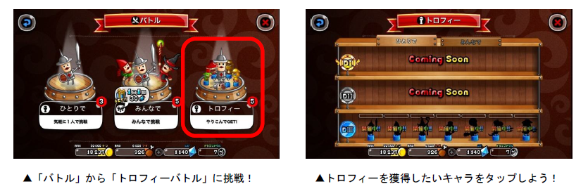 「トロフィーバトル」は、各キャラのトロフィー獲得を目指して、全国のプレイヤーとバトルを行なう