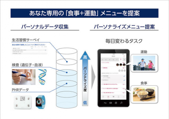 「パーソナルカラダサポート」は、お客さまの生活習慣サーベイの結果や体重・歩数データなどのパーソナルデータをもとに、一人一人専用の生活習慣改善メニューをスマートフォン向けアプリにて表示するサービスです。また、利用者間のSNS機能や、オプションで管理栄養士指導やオーダーメイドサプリなどを追加利用することができます。