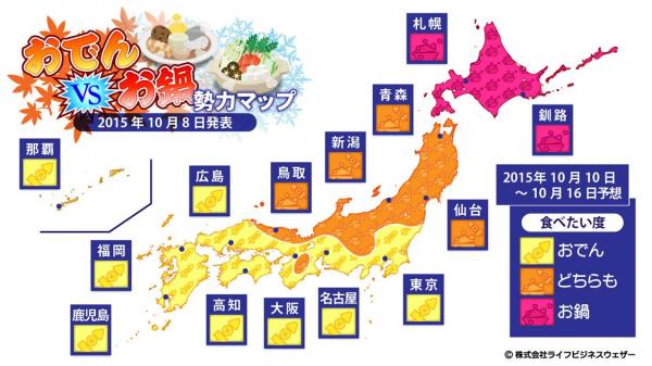 株式会社ライフビジネスウェザー(本社:東京都中央区、代表取締役:石川勝敏 以下、LBW)は2015年10月8日、寒い時期に恋しくなる“おでん”と“お鍋”のどちらがより食べたくなるかを予想する「おでんvsお鍋勢力マップ」を発表致しました。 LBWの調べによると、おでんやその食材は初秋期、寒さが増すほど売上が増加しますが、より秋が深まり最低気温が10度を下回るようになると、おでんに代わって鍋物関連の商品のほうが売上が増加することが分かりました。この結果をもとに、向こう一週間の予想気温から、おでんとお鍋の”食べたい度”を算出し、マップでお知らせします。また、期間中で一番冷え込みの強い日を「イチオシ!ぐつぐつ日和」として、お知らせします。