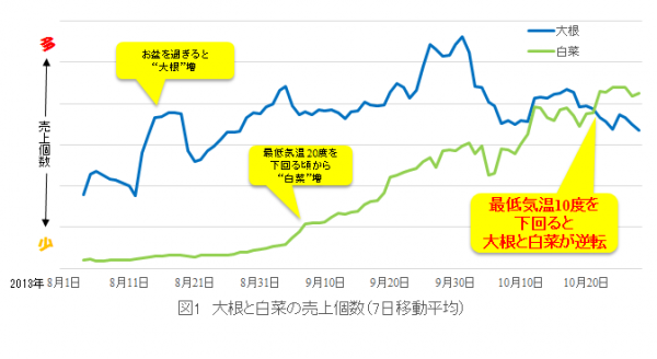例えば、関東地方の複数店舗において、おでんの代表格である大根と、お鍋に活躍する白菜を比較した所、お盆を過ぎるとおでんの売上増加に伴って大根の売上が伸びますが、9月に入り朝の最低気温が20度を下回るようになると白菜の売上が伸び出し、10月に入って最低気温が10度を下回る頃になると、白菜の売上が大根を上回るようになっていました。寒さが増すと、おでんよりもお鍋を選ぶ家庭が増えるためと考えられます。