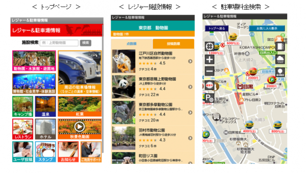 動物園・水族館・遊園地などのアミューズメント&レジャー施設の情報、観光地の季節ごとの情報やイベント情報、駐車場情報をお届けします。駐車場情報は、満車・空車情報、提携店舗割引情報、周辺駐車場との料金比較に便利な入出庫時刻設定、現在地からルート検索できる機能も備えています。