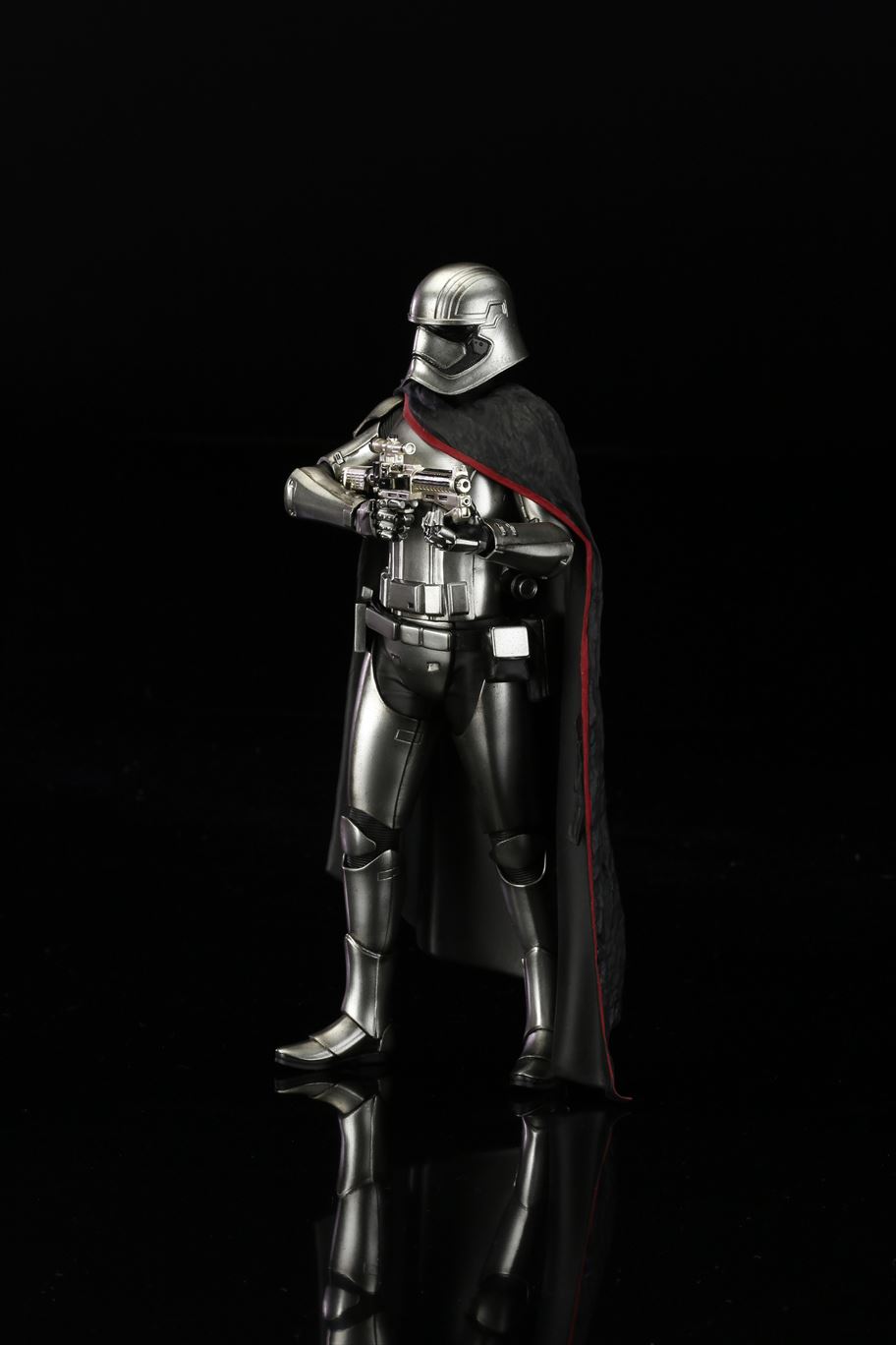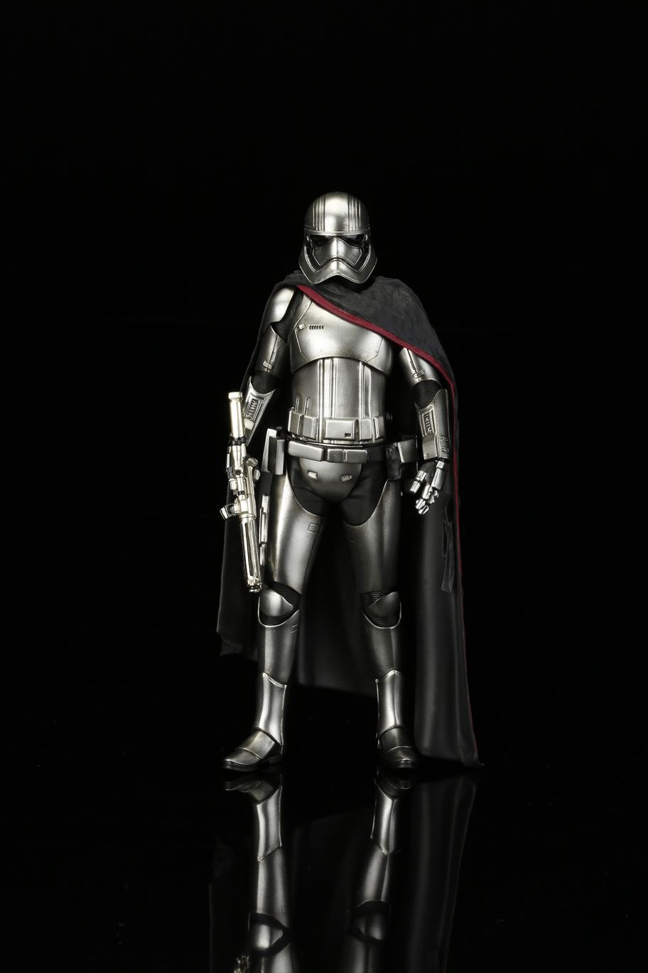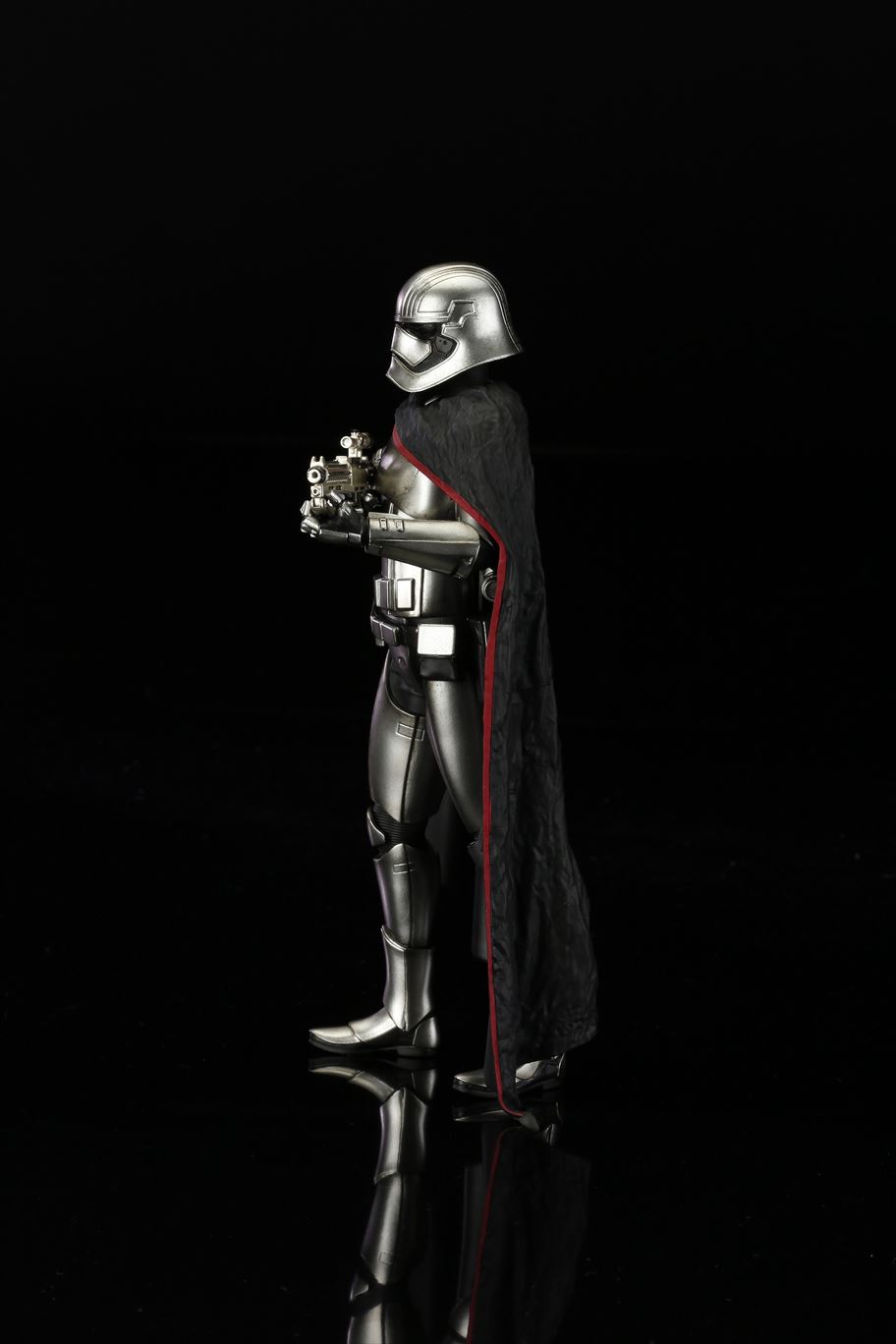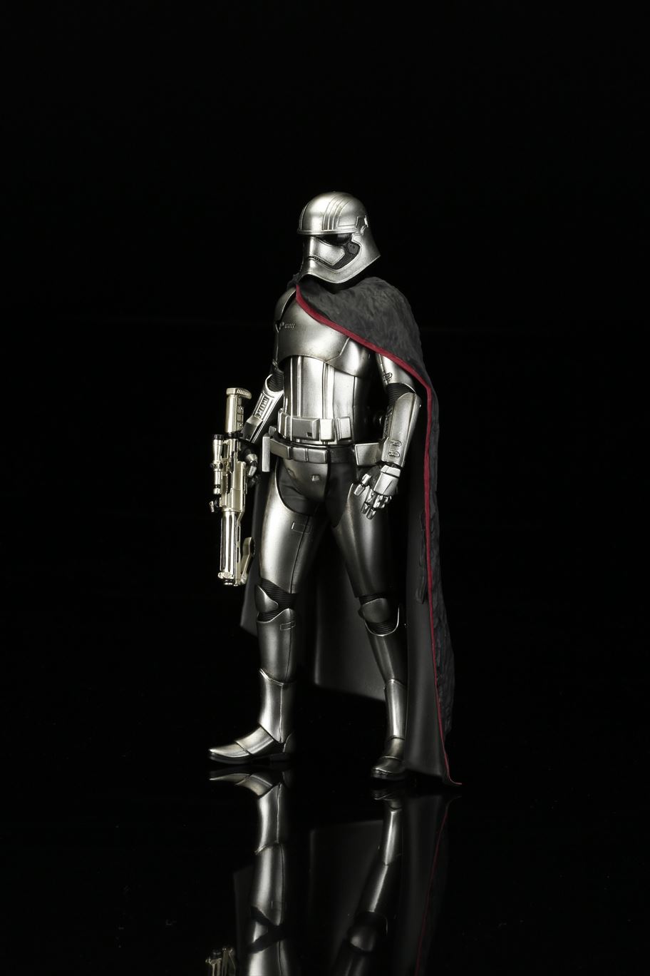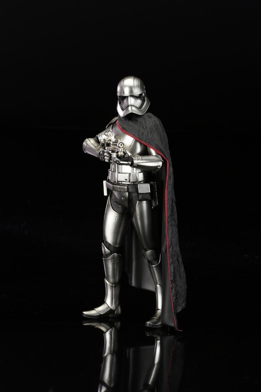 特徴的なドレープの付いたマントから覗く銀色の鎧は、メッキを使って再現。また、腕の差し替えで銃を構えたポーズと下したポーズ2通りの展示が可能です。商品は塗装済みの簡易組み立てキットなので開けてすぐに飾れます。足裏にはマグネットが入っており、鉄板入りのスクエア台座を使って自由度の高いディスプレイをお楽しみいただけます。