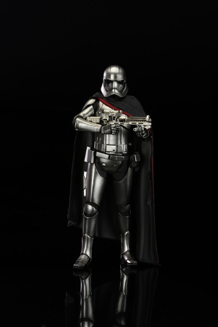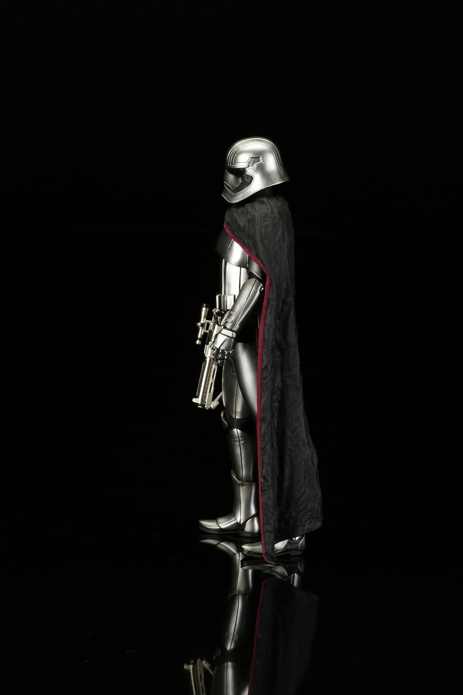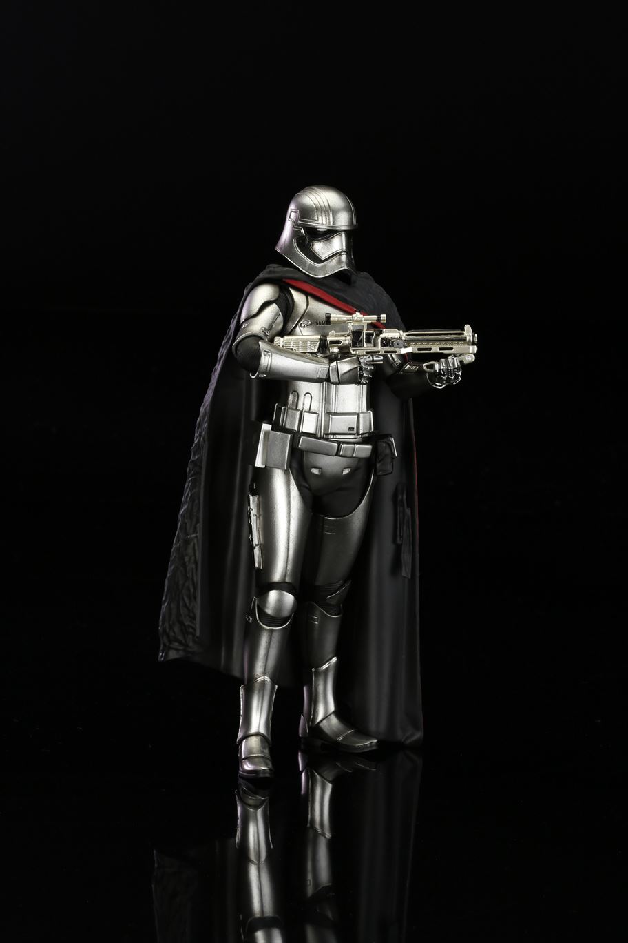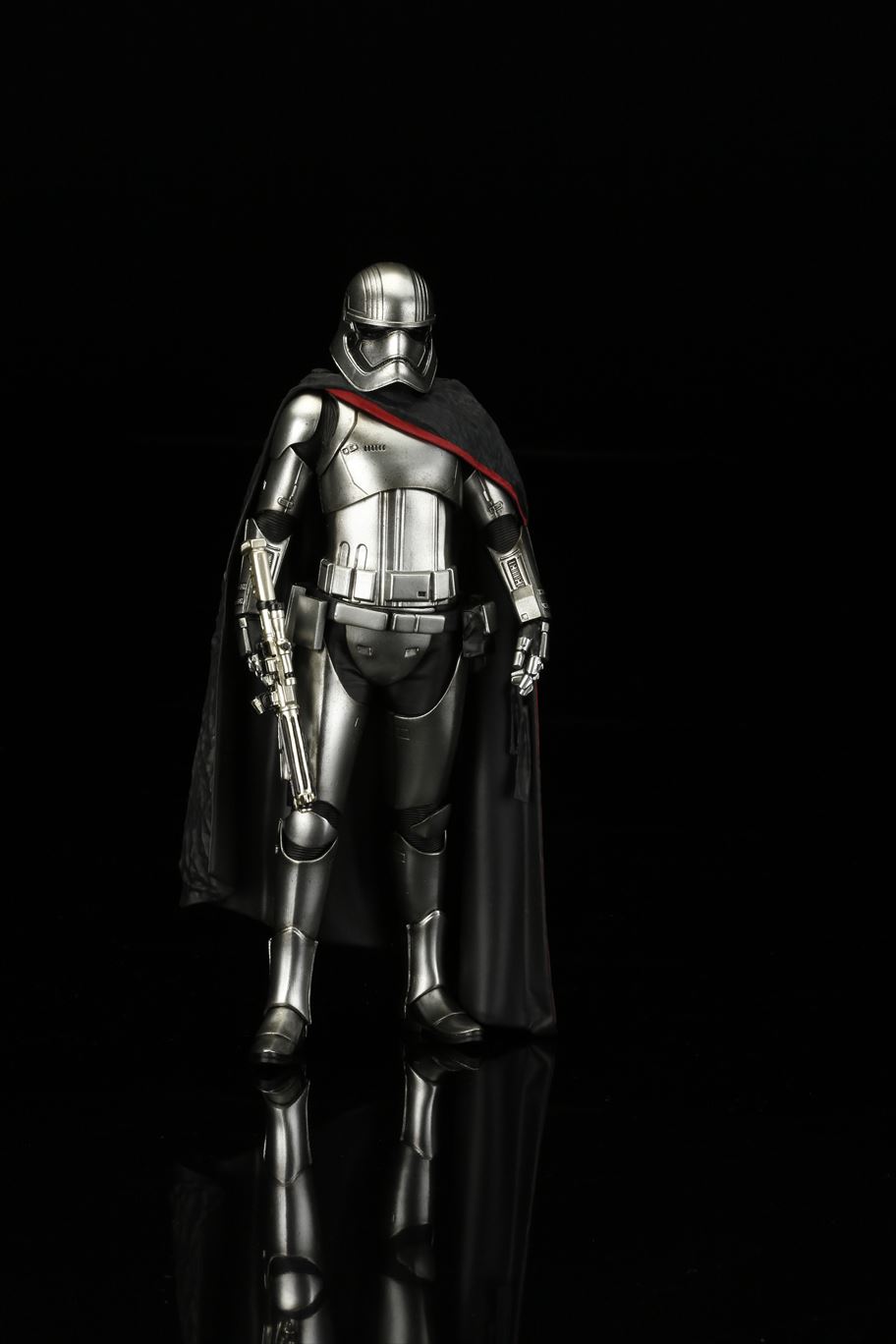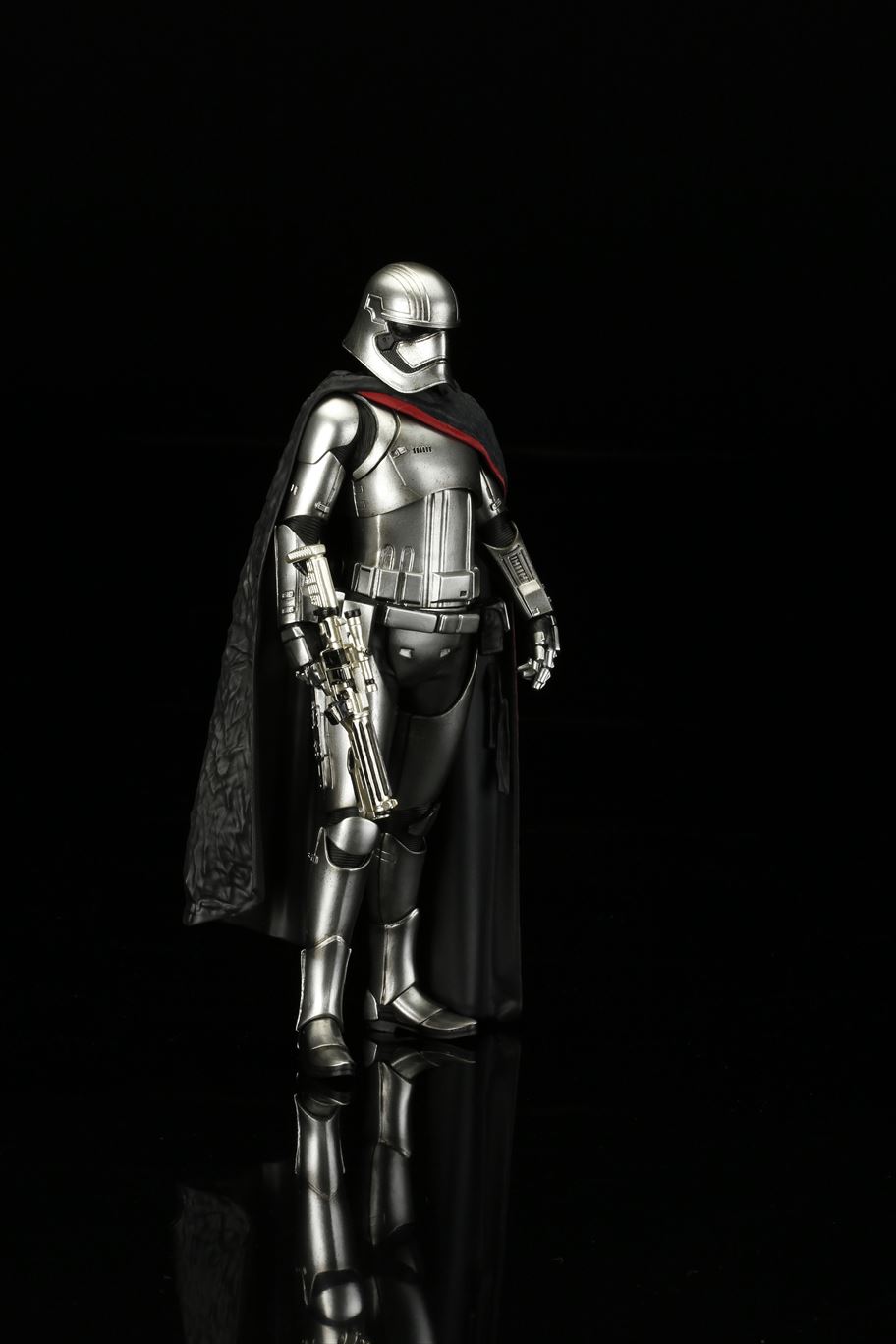特徴的なドレープの付いたマントから覗く銀色の鎧は、メッキを使って再現。また、腕の差し替えで銃を構えたポーズと下したポーズ2通りの展示が可能です。商品は塗装済みの簡易組み立てキットなので開けてすぐに飾れます。足裏にはマグネットが入っており、鉄板入りのスクエア台座を使って自由度の高いディスプレイをお楽しみいただけます。