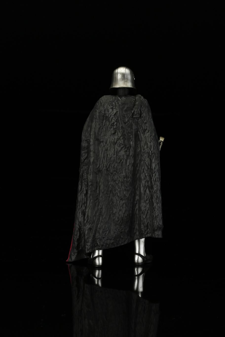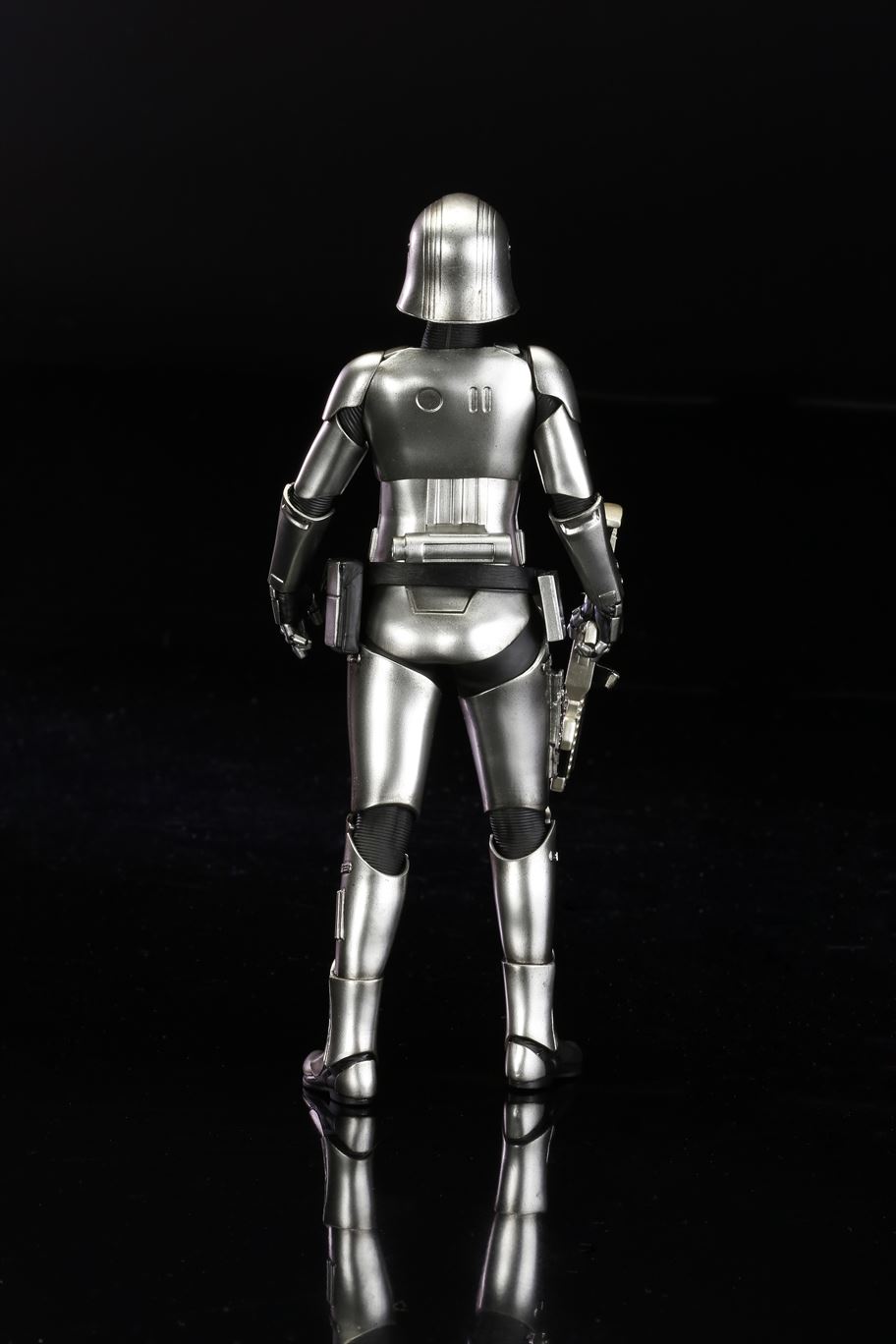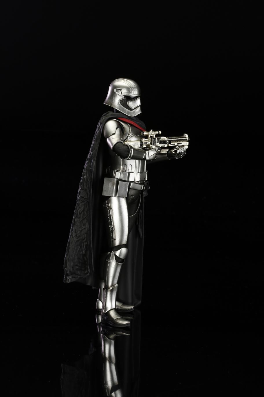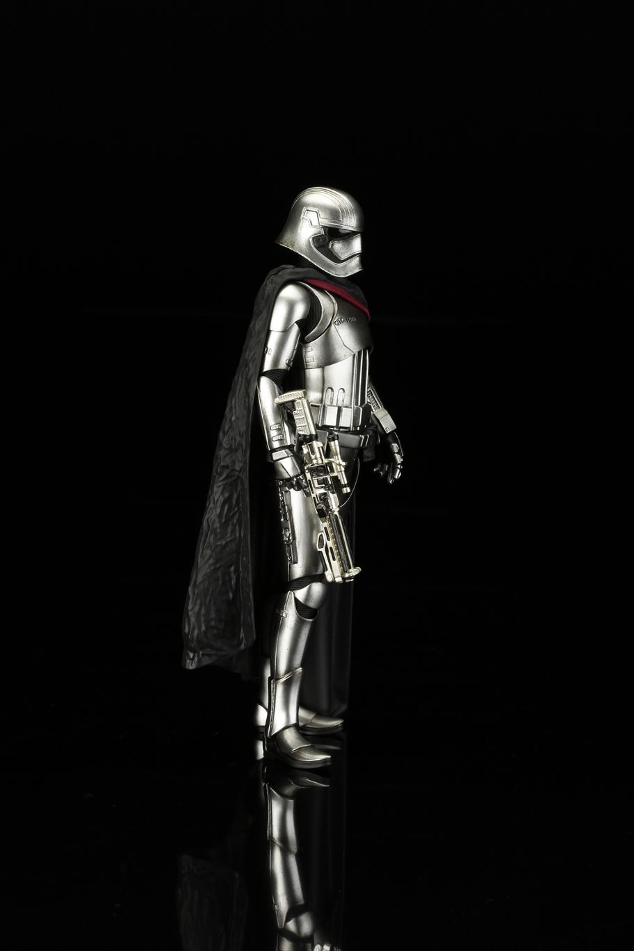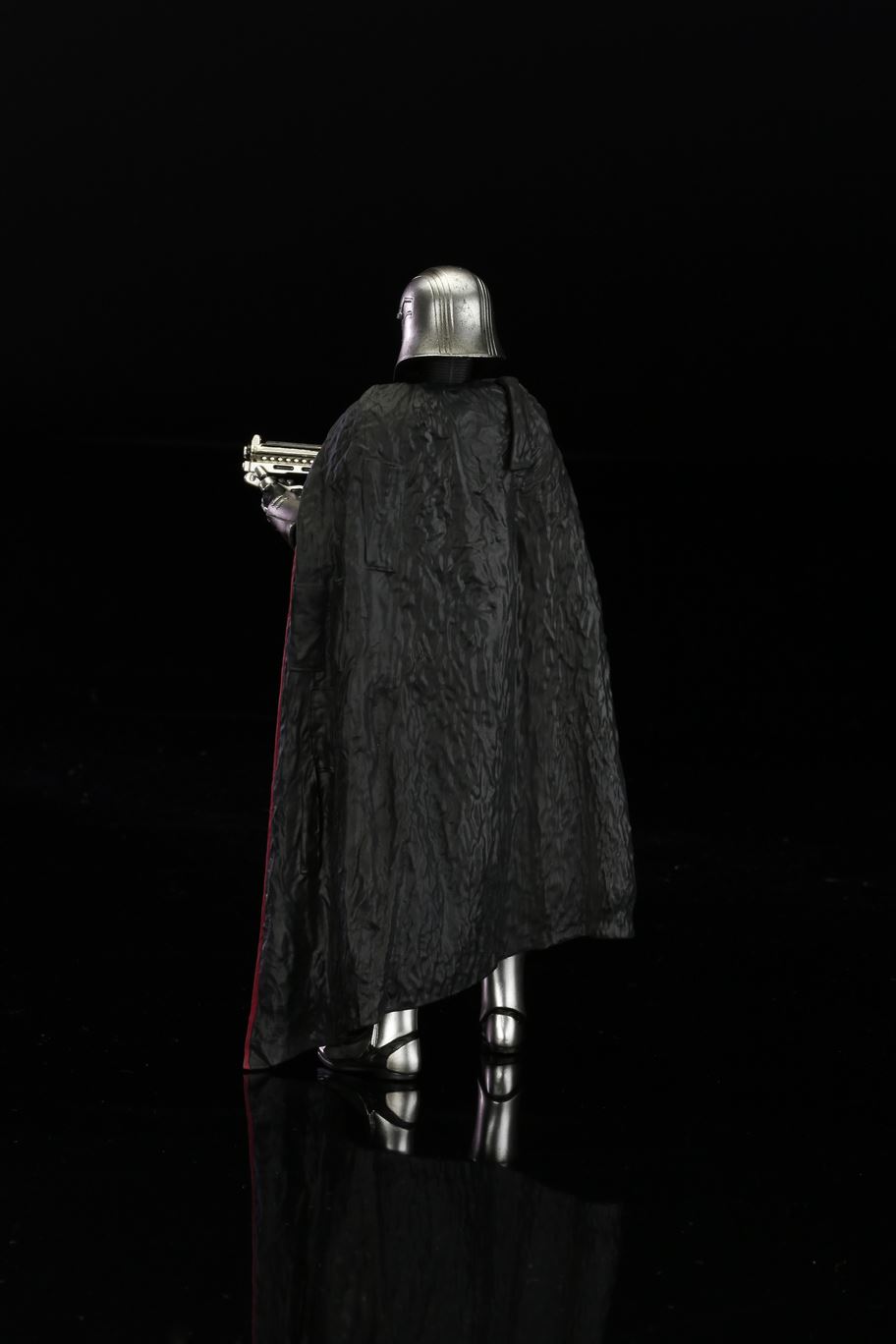 特徴的なドレープの付いたマントから覗く銀色の鎧は、メッキを使って再現。また、腕の差し替えで銃を構えたポーズと下したポーズ2通りの展示が可能です。商品は塗装済みの簡易組み立てキットなので開けてすぐに飾れます。足裏にはマグネットが入っており、鉄板入りのスクエア台座を使って自由度の高いディスプレイをお楽しみいただけます。