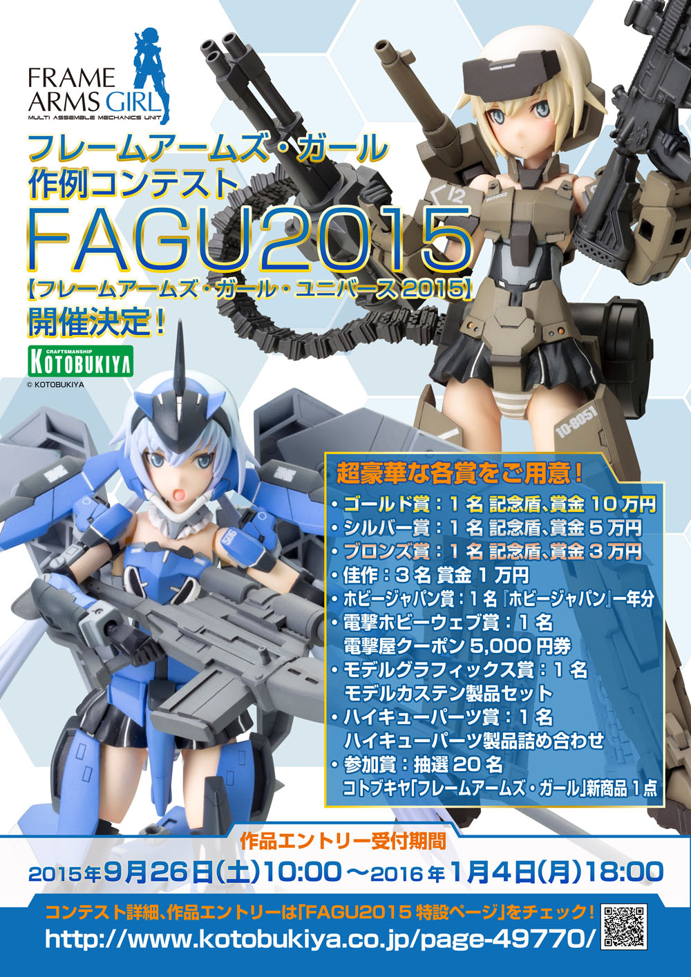 ホビーメーカー株式会社壽屋(本社:東京都立川市曙町/代表:清水一行)は、自社プラモデル「フレームアームズ・ガール」シリーズを対象とした模型コンテスト「フレームアームズ・ガール・ユニバース2015 -FAGU2015-」を開催中です。