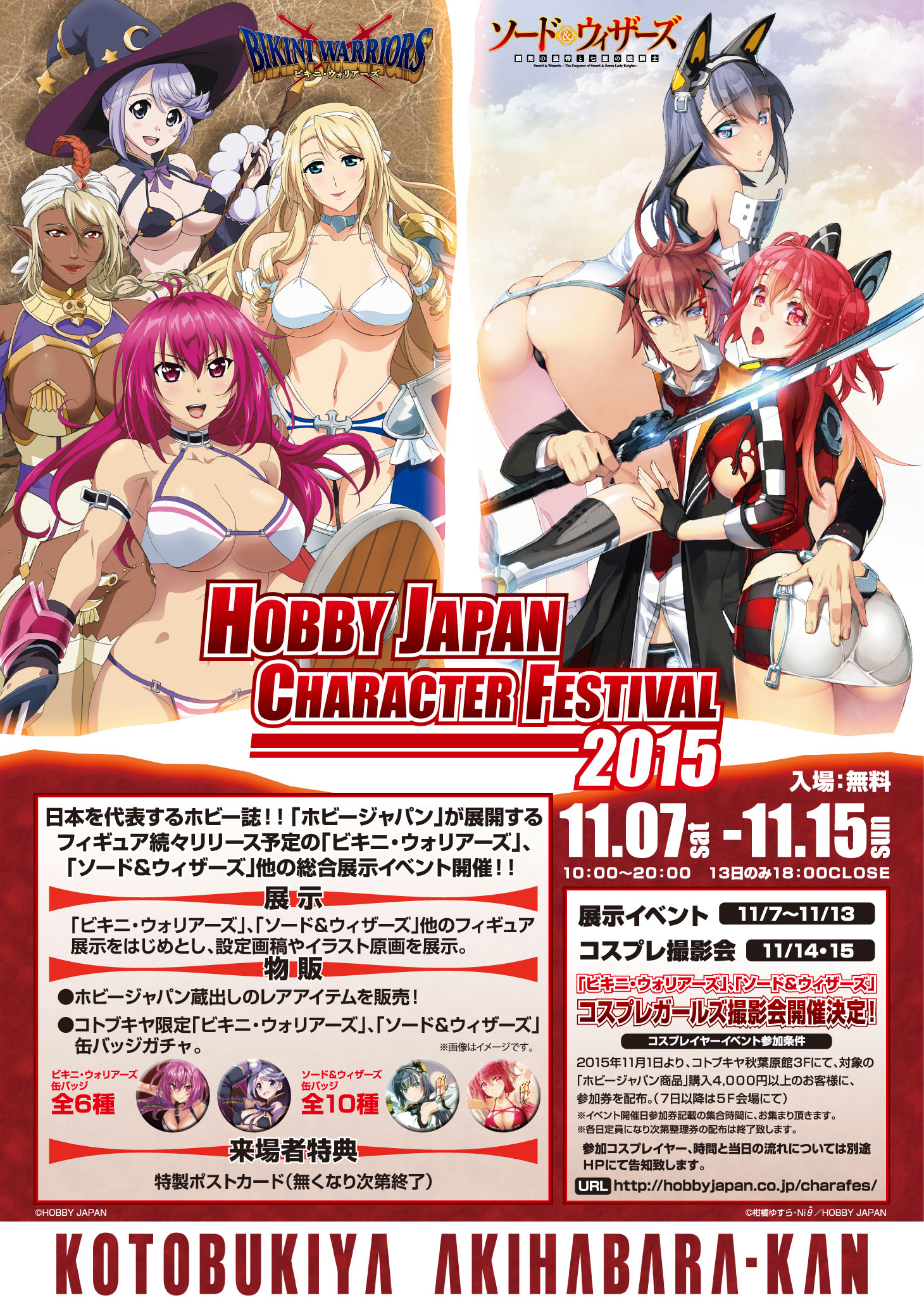 ホビーメーカー株式会社壽屋(本社:東京都立川市曙町/代表:清水一行)は、2015年11月7日(土)より11月15日(日)、コトブキヤ秋葉原館5Fイベントスペース「コトブキヤベース・アキバ」にて、ホビー誌『ホビージャパン』(株式会社ホビージャパン)が展開する作品「ビキニウォリアーズ」「ソード&ウィザーズ」などの総合展示会『HOBBYJAPAN MEDIA FESTIVAL2015』を開催します。