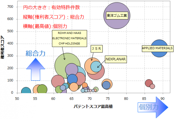CMP(化学機械研磨)は研磨パッドを動かすことにより、スラリーがキャリアの凹凸を研磨することから、研磨パッドの材質や形状、各種物性値等が研磨特性に大きく関わってきます。本調査ではCMP用研磨パッドに関する特許を集計し、各個別特許の注目度を得点化する「パテントスコア」をベースとして、特許の質と量から総合的に見た評価を行いました。