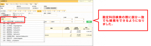 勘定科目の検索機能を拡充し、部分一致検索にしたことで、勘定科目の一部分を入力すればスムーズに勘定科目を見つけられるようになりました。