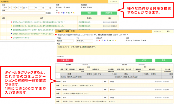 記帳指導ツールとして会計事務所や商工会議所から高くご評価いただいている、伝票単位で質問のやりとりができる「付箋機能」の検索性を大幅に向上し、記帳指導先とのやりとりを見やすくすることを通じてより円滑なコミュニケーションを実現します。