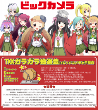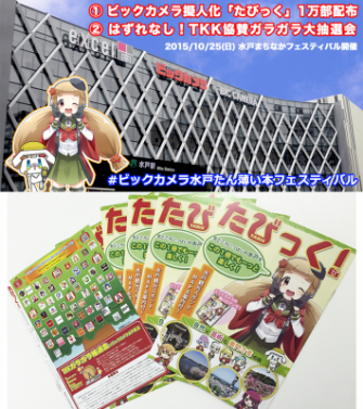 今回は、2015年10月25日(日)に水戸市で開催される「水戸まちなかフェスティバル」に合わせた企画で、ビックカメラ水戸駅店の擬人化「水戸たん」の漫画観光本の1万部の配布と、水戸たんを応援するTKK(ツイッター華麗なる公式 約60社)協賛のガラガラ大抽選会を中心とした企画です。