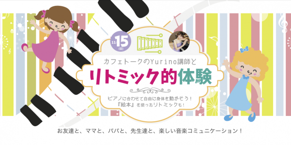 今回は11月15日に東京オペラシティにカフェトーク在籍のyurino講師を迎え、2歳頃から小学校低学年までのお子様がお友達やご兄弟で楽しくご参加頂ける、ピアノや絵本を使った「リトミック的体験」イベントを開催いたします。