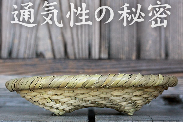 篠竹干しざるの最大の特徴は底編みにある足部分。底の四隅が足のように立ち、底の浮き上がったアーチ型となっています。ざる底と接地面に空間があるため、風通しが良く、水切りに優れた作り。底編み部分はしっかりした網代編みで仕上げられ、ちょっとした食器入れにもお使いいただけます。また、水に触れるざるの内側部分と、底足四隅の外側部分には水気に強い竹表皮が出る編み方も見どころの一つ。職人の細やかな工夫が感じられる炊事場用竹ざるなのです。