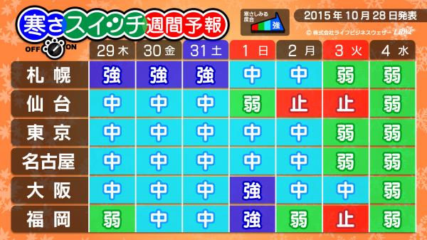 29日(木)から31日(土)は札幌で寒さスイッチ「強」が入ります。そのほかの各地も、来週前半にかけて「中」の所が多く、大阪と福岡では1日(日)には今シーズン始めて「強」が入りそうです。3日(火)ごろからは、寒さスイッチが弱まるでしょう。