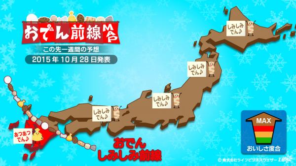 冷たい季節風が吹く季節になってきました。しみしみ前線は、いっきに九州北部から四国まで南下するでしょう。北海道から九州北部の各地は、味が最高にしみた、しみしみおでんが冷えた体を温めてくれるでしょう。九州南部にも、もうすぐしみしみ前線が到達しそうです。