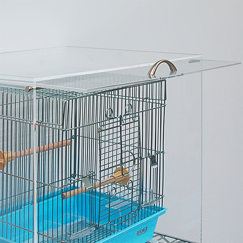 扉を閉める事で全面がアクリルケースで覆われる為、ケースからの羽や餌などの飛び散りを防ぎます。また、完全防音ではありませんが、鳥さんの甲高い鳴き声が籠った様に聞こえ、鳴き声問題を緩和します。
