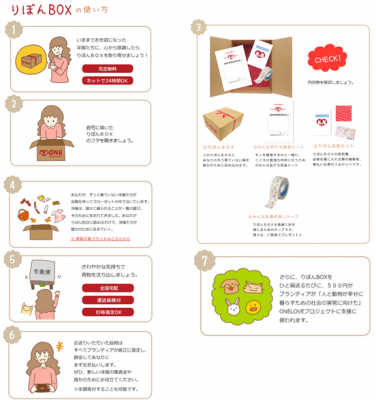 環境省が発表するデータによると、平成25年度に年間21万頭の犬や猫だけでも無責任な飼い主による飼育放棄や迷子、所有者がいないなどの理由で保健所へ引き取られ、年間16万頭が、ガス室や注射などによって殺処分されています。この現状に心を痛め、身近なことで気軽に支援できないかと思う人の行動を後押しするために「りぼんBOX」の企画が始まりました。自宅にある“もう着ない洋服”を詰めて「ブランディア」に送ると、利用者に代わってブランディアが1箱につき500円を「ONE LOVEプロジェクト」を通じて動物保護のために寄付できる新しい形の宅配買取サービスです。またお客様の任意で、買取金額の一部もしくは全額を「人と動物を取り巻く環境を改善するための支援活動」につながる公益社団法人アニマル・ドネーション支援先の動物保護団体から選び寄付することもできます。