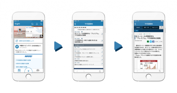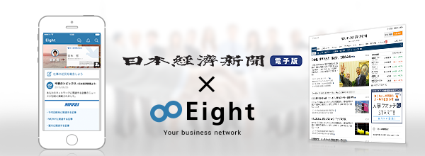 Sansan株式会社(本社:東京都渋谷区、代表取締役社長:寺田親弘、以下Sansan)は、11月4日、提供する個人向け名刺管理アプリ『Eight(エイト)』が日本経済新聞社(東京都千代田区・代表取締役社長:岡田直敏)の『日本経済新聞 電子版』と連携し、登録した名刺に関連した記事を自動でお知らせするサービスを始めました。日々のニュースの中から、自社や得意先などの自分のビジネスに関連したニュースを簡単に知ることができます。