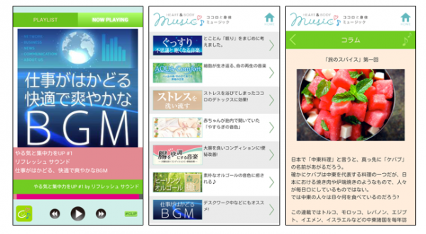 『ココロと身体ミュージック♪』は、ヒーリング系楽曲を中心に、健康づくり、メンタルヘルス、トレーニング時にオススメの楽曲等を聴き放題でお楽しみいただける音楽配信サービスです。旬の季節レシピ、アスリートや声優のインタビュー等、健康・実用系コンテンツも取り揃えています。