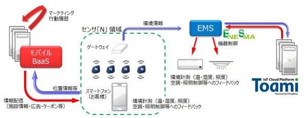 「BLEスマートセンサN」は、温・湿度、照度、紫外線など複数のセンサ情報をBLEビーコンで発信することが可能なセンサビーコンです。複数の「BLEスマートセンサN」が計測した情報はペアリング不要で、1つのゲートウェイを介してクラウド上のIoTプラットフォームに収集されます。 今回提供を開始するBLEスマートセンサソリューションでは、「BLEスマートセンサN」が持つ環境モニタリング情報とビーコンIDによる位置情報の2つの特性を活かし、小売量販店や大型商業施設、飲食店など向けに、建物内の消費電力管理を実現するEMS(エネルギーマネジメントシステム)と、来場者のスマートフォンにニュースやクーポンなどを配信するモバイルO2O(Online to Offline)サービスを、1つのインフラで提供することを可能にしました。