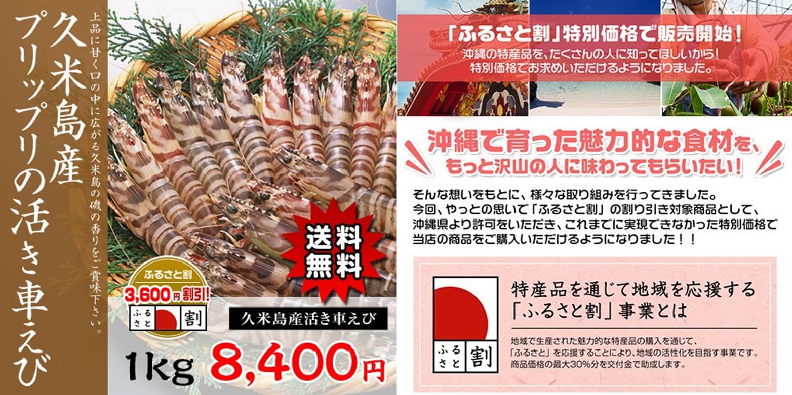 琉球インタラクティブ株式会社(本社:沖縄県宜野湾市、代表取締役社長:臼井 隆秀、以下「琉球インタラクティブ」)は、当社の沖縄最大級の通販サイト『沖縄特産品本舗』において、『久米島産の活き車えび』を新たに「ふるさと割」対象の沖縄県産品ラインナップに追加、本日2015年11月10日(火)※より30%割引の特別価格1kg:8,400円(税込・送料無料)にて提供を行います。