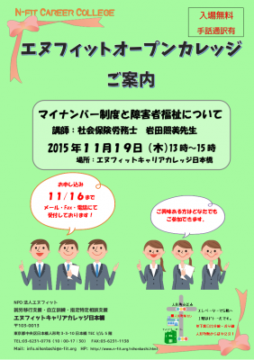 障がい者の就労と自立を支援するNPO法人エヌフィット(東京都中央区)は、来たる11/19(木)、「マイナンバー制度と障害者福祉について」と題したセミナーを開催します。
