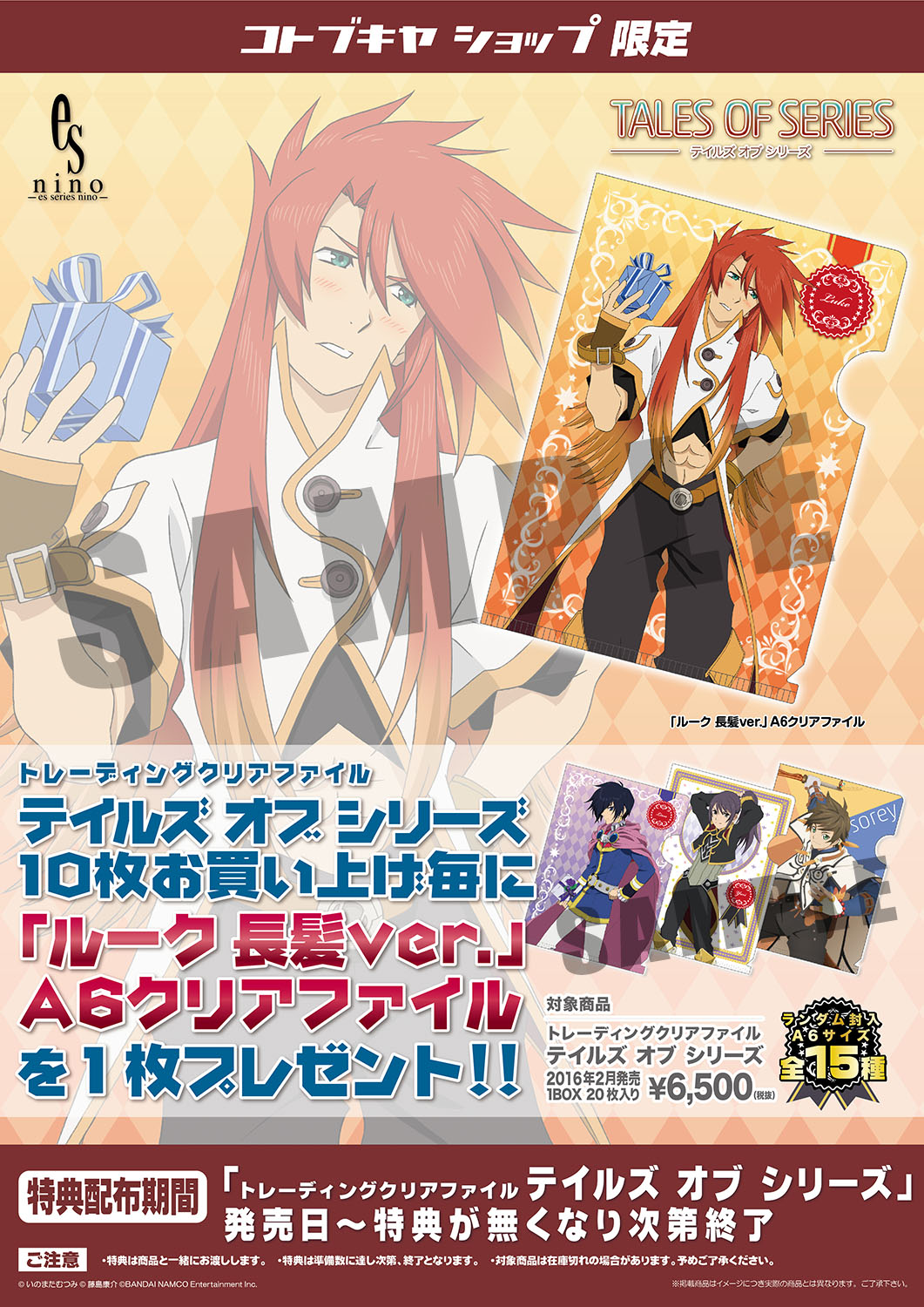 『テイルズ オブ アスタリア』の豪華イラストを使用したスタイリッシュなクリアファイルが登場です。キャラクターラインナップは[リオン・マグナス、リリス・エルロン、ゼロス・ワイルダー、ルーク・フォン・ファブレ、ティア・グランツ、ジェイド・カーティス、アッシュ、ユーリ・ローウェル、リタ、レイヴン、アスベル・ラント、ルドガー・ウィル・クルスニク、ジュード・マティス、スレイ、ミクリオ]の全15種。サイズは集めやすくて、使いやすいA6サイズです。『テイルズ オブ』シリーズのキャラクター達を集めて楽しめるコレクションアイテムです。コトブキヤショップ(秋葉原館、大阪日本橋、オンラインショップ)では、当商品を10枚購入毎に「ルーク 長髪ver.」のクリアファイルを1枚プレゼントいたします。