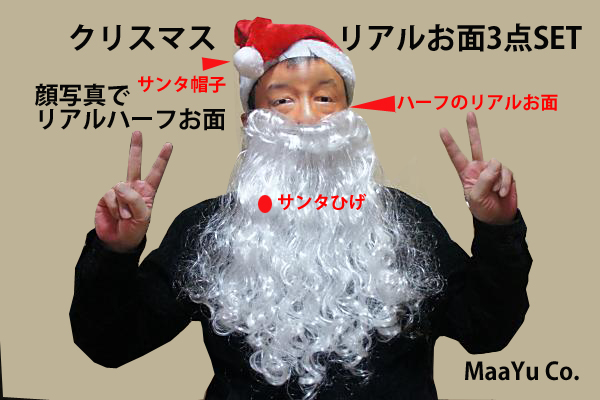 価格は3点セット15000円(税別)(3Dリアルお面ハーフ+サンタひげ+サンタ帽子)