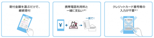 ※1 SoftBankのスマートフォン以外をご利用の方は、一回ごとの「都度寄付」のみとなります。SoftBankのスマートフォンをご利用の方も、「毎月継続寄付」のチェックを外すと一回ごとの「都度寄付」に変更することができます。「毎月継続寄付」の解除は「支援団体リスト(http://ent.mb.softbank.jp/apl/charity/sp/groups.jsp)」から行えます。