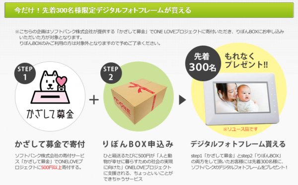 「既成概念にとらわれることなく新しい価値を見出す」を理念に掲げるデファクトスタンダードのりぼんBOXと「情報革命で人々を幸せに」を経営理念に掲げるソフトバンクのかざして募金は、共同で始める新企画により、サービスの利用促進を目指します。1箱送るたびに500円が動物のために寄付されるりぼんBOXのサービス(寄付金はブランディアが負担)に加えて、かざして募金により追加で寄付いただいたお客さまに、先着300名様限定で、ソフトバンク限定デジタルフォトフレーム[高橋1] が貰える企画を開始します。このタイアップ企画を通じ、犬をはじめとする全ての動物の幸せをつなぐための支援活動を、より多くの人に伝え現状を変えていきたいと思っています。