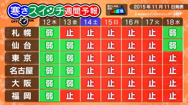 立冬を過ぎ、暦は冬になりましたが、この期間中、寒気の南下はなさそうです。逆に週末以降は、暖かい空気が日本付近を覆うため、寒さスイッチは「止」の所が多くなるでしょう。まだしばらくは、秋の装いで過ごせそうです。札幌や仙台では、水曜日になると再び「弱」が入りそうです。