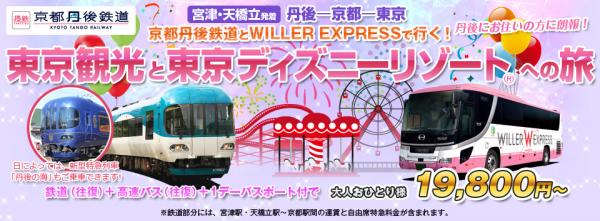 WILLER TRAINS株式会社(http://trains.willer.co.jp/、代表取締役:村瀨 茂高)が運行する京都丹後鉄道(以下、丹鉄)をはじめとする天橋立駅・宮津駅~京都駅間の鉄道乗車券と高速バス「WILLER EXPRESS」とをセットにしたお得な商品「京都丹後鉄道とWILLER EXPRESSで行く!東京観光と東京ディズニ―リゾート(R)への旅」が、本日よりWILLER TRAVELサイト(http://travel.willer.co.jp/tour/campaign/tdr/tantetsu/)で19,800円~※にて販売開始されます。(※【0泊3日(車中2泊)】東京ディズニーリゾート(R)パスポート付プランの場合)