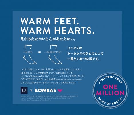 このパートナーシップはGapが継続して取り組んでいる、地元コミュニティの支援とホリデーシーズン中の社会への還元というコミットメントの一環として実施されます。Bombas社は2013年に設立されて以降、Bombasはソックスが1足売れるたびに、援助を必要としている人たちにソックス1足を寄付することをコミットメントとして掲げてきました。今日までにアメリカ国内では50万足のソックスを寄付しました。この偉業に喚起されたGapは、Bombasのミッションの認知度を世界中で高めるというコミットメントを掲げ、両ブランドはGapがストアを展開し、かつ本キャンペーンに参加する国で100万足のソックスをホームレスシェルターに寄付するという共通のゴールを設定しました。