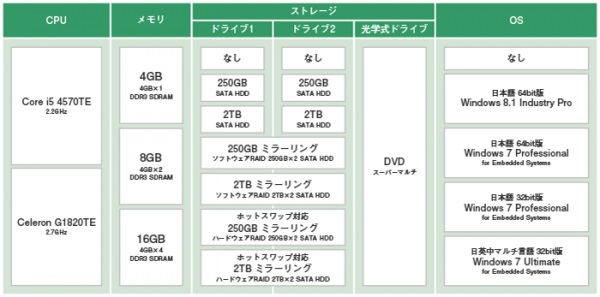 省電力・ハイパフォーマンスの低電圧版プロセッサCore i5-4570TE (2.2GHz)またはCeleron G1820TE (2.7GHz)、QM87チップセット、メモリ4GB以上を標準搭載しており、高い演算・描画能力を実現しています。CPUやチップセットは、Embeddedタイプの採用により安定供給を可能にしています。