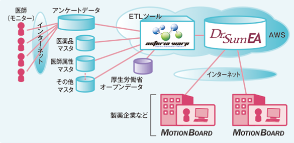 また、アンケート結果や医師の属性マスタ、医薬品マスタなどの分析に必要なソースデータのクレンジングを行うAWS上で稼動させるETLツールには、専門知識が必要なくアイコンを並べるだけで簡単に加工のフローを開発できるインフォテリアの「ASTERIA WARP」を採用しました。