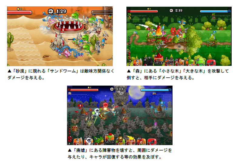 リーグとフリー対戦の全モードで、フィールドが日替わりで「砂漠」「森」「廃墟」に変化する