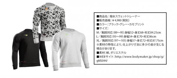 日本発のスポーツブランド 「ボディメーカー」は、アウトドアでのスポーツをサポートするために「濡れない」をコンセプトに作られた、「撥水スウェット」を、10月下旬~11月上旬頃に全国のボディメーカー直営店及びオンラインストア(http://www.bodymaker.jp/)で販売開始。