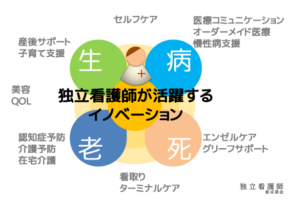 健康や長寿への関心が高まる今、 「ナースほど起業の可能性に満ちた職業はない」といわれます。「独立看護師養成講座」は、 訪問看護ステーション等の開業はもちろん、 「ライフスタイルを重視した働き方をしたい」「専門性を磨きたい」「アイデアを生かして誰かの役に立ちたい」など、キャリアをより充実させたい看護師を応援するプロジェクトです。臨床の看護師・助産師から経営者・大学教授に転身した佐々木由惠先生を監修者に迎え、理論と実践の両面でそれぞれのスタイルに合った「独立」をサポートします。