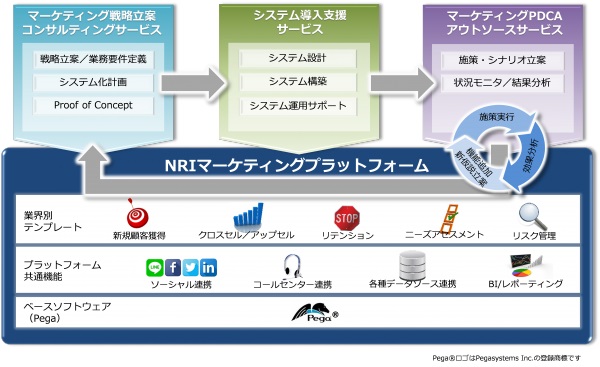 今回NRIは、ペガに対してシステムインテグレーション関連技術を提供すると共に、日本独特の商習慣や、顧客(業界)ごとに必要とされる業務知識などのノウハウを、「Pega Marketing」に追加します。