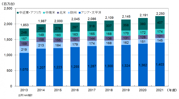 世界の携帯電話端末(スマートフォンを含む)の販売台数はアジア地域を中心に拡大しており、2014年度の19億8,700万台から2021年度は22億5,000万台へとゆるやかな成長を予測(図1)。