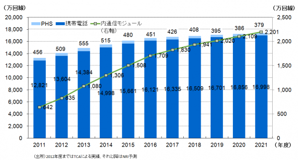 国内携帯電話契約回線数は、IoT市場の増大、タブレット端末や通信モジュールが組み込まれた機器の増加、多様なMVNO(Mobile Virtual Network Operator、仮想移動体通信事業者)の登場などにより、2014年度の1億4,998万回線から2021年度には1億6,998万回線に増加する(図2)。