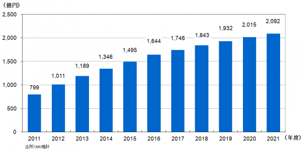 動画配信市場は、携帯電話事業者が自社端末向けに提供するサービスの普及や、2015年9月にサービスを開始した米国の大手動画配信サービス「ネットフリックス」など、月額固定料金で豊富な映像コンテンツを視聴できるサービスの利用が拡大する。これにより、同市場は国内で2014年度の1,346億円から2021年度には2,000億円を超える規模に成長すると予測される(図4)。