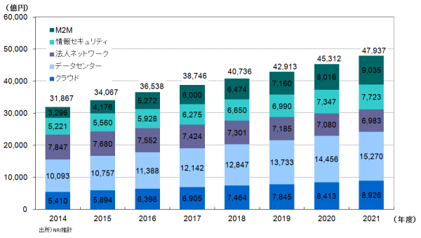 データセンター、クラウドは、2021年度まで引き続き堅調に増加。また、増大するサイバー攻撃などの脅威により、情報セキュリティ市場はますます拡大していく。