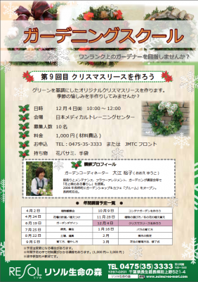 < “いきがい・絆・健康・くつろぎ” 情報 >リソル生命の森「お茶の間ゼミ」12月の開催日程!「X’masリース作り」「老後・介護を考える」「素数の話」「クリスマスコンサート」他