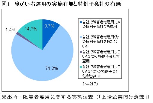 回答した上場企業のうち、特例子会社を持たずに障がい者を自社で雇用している企業は74.2%でした。特例子会社と自社の双方で障がい者を雇用している割合は9.7%、特例子会社のみで雇用している企業は1.4%でした。障がい者を自社、特例子会社のいずれにおいても雇用していない会社が14.7%あります(図1)。