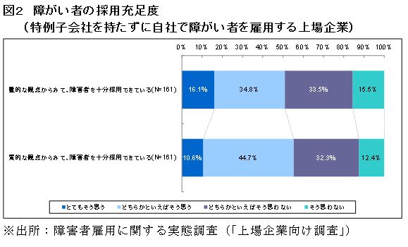 特例子会社を持たずに自社で障がい者を雇用する上場企業のうち、量的な観点からみて、障がい者を十分採用できているかという質問に対して、「とてもそう思う」「どちらかといえばそう思う」と答えた企業はそれぞれ16.1%、34.8%であり、「どちらかといえばそう思わない」「そう思わない」と答えた企業は33.5%、15.5%でした。質的な観点からの同様な質問については、「そう思う」「どちらかといえばそう思う」と答えた上場企業は、10.6%、44.7%でした(図2)。いずれの面でも、約半数の企業が採用上の問題を感じています。