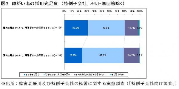 一方、回答を寄せた特例子会社の約8割は、量的な観点からみて、障がい者を十分採用できているかという質問に対して、「とてもそう思う」(30.9%)、「どちらかといえばそう思う」(48.9%)と答えています(図3)。質的な観点からの採用状況もほぼ同様の傾向であり、特例子会社を持たず自社で障がい者を採用する上場企業の方が、量的、質的観点から障がい者の採用に対して、課題を抱えている様子がうかがえます。