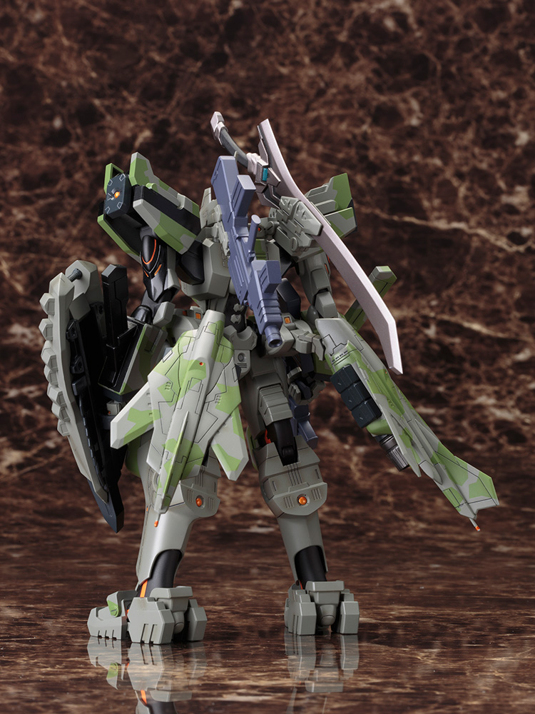 特徴的な頭部は新規造形で、頭部カメラはクリアパーツで再現されています。成型色は第666戦術機中隊"黒い宣告"カラーを採用、肩の部隊章は「微章デカール」で再現。背部にある兵装担架は可動し“背面撃ち”を再現、また、肘を逆に曲げる事で突撃砲を“背面に向ける事”が可能。下腕を内部のレールでスライド伸長することにより、ひじ関節の可動範囲が拡大しています。肩アーマーは2軸関節とボールジョイント仕様、でフレキシブルに可動、DS-3多目的追加装甲のグリップ部分が上下にスライドする事が出来ます。※本商品は「フライングベースR」に対応しております。