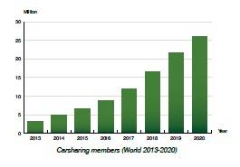 スウェーデンの調査会社ベルグインサイト社(Berg Insight)の調査レポート「カーシェアリングテレマティックス市場」は、カーシェアリングの会員数は、2014年末から2020年までにCAGR33%で急増し、480万から2600万に成長するだろうと見込んでいます。ステーションベースとフリーフロート型の両方のカーシェアリングの市場全般について調査し、カーシェアリング企業、ベンダ、製品、市場の最新の情報を提供しています。