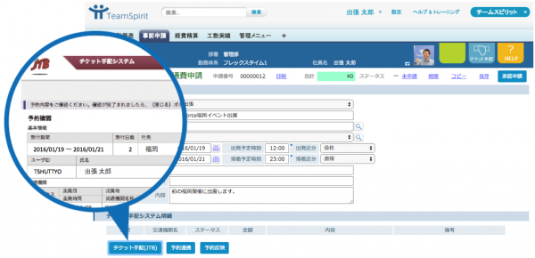 今回発表した新機能「出張手配機能」は、このような課題を解決するために、「ジェイズナビジュニア」と連携し、「ジェイズナビジュニア」で手配した宿泊、航空券、出張パックのチケット情報をTeamSpiritの事前申請や経費精算と連携させる機能です。